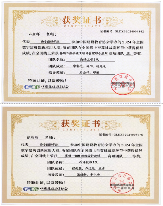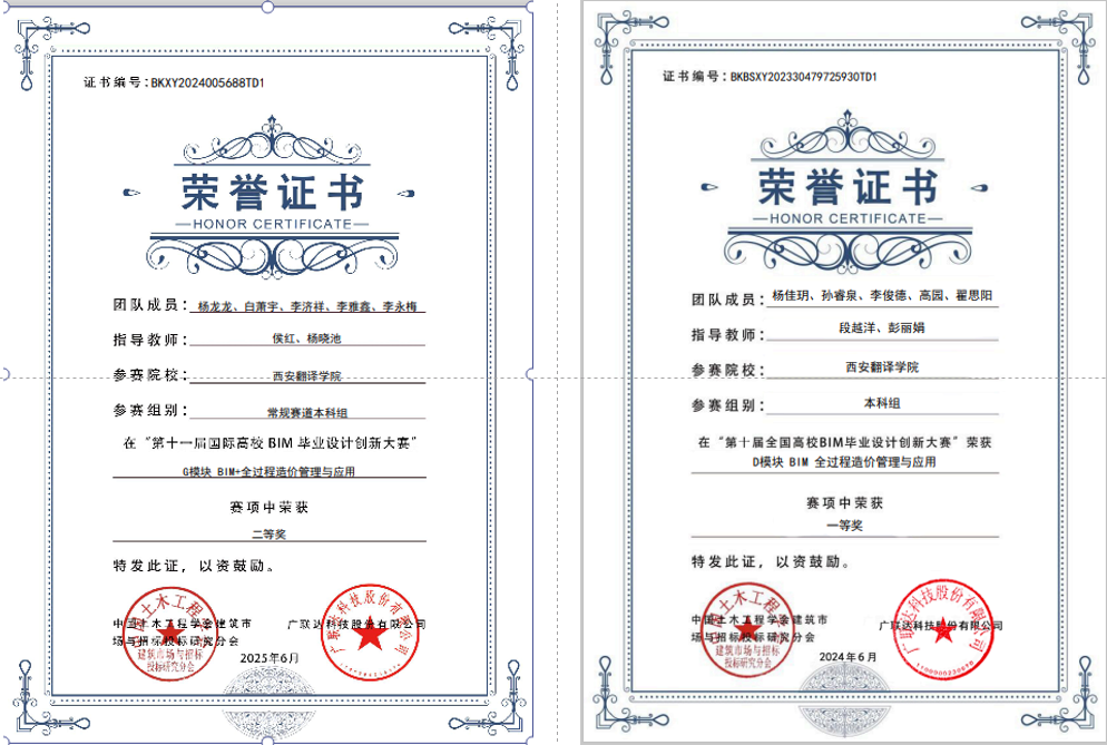 学科竞赛方面,落实“以赛代培、以赛促教、以赛促学、以赛促训、以赛促改”的竞赛效果,学院搭建建筑工程识图竞赛、数字建筑工程造价综合应用竞赛、3D建筑模型设计竞赛和工程测量技能竞赛为代表的系列竞赛平台,积极参加省级及以上大学生应用技能竞赛。积极指导学生参加国际高校BIM毕业设计创新大赛、全国数字建筑创新应用大赛、陕西省和全国大学生施工仿真应用技能大赛、BIM应用技能大赛、BIM电子招投标大赛等。我校学生连续获得一等奖、二等奖以及最佳组织奖。