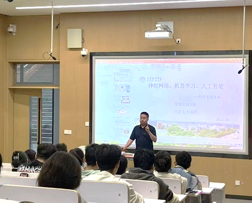 2023年9月20日下午16点,由我校人工智能翻译陕西省高校工程研究中心主办,Beat365唯一官方网站承办,面向全院师生主题为“何为神经网络,何为机器学习,何为人工智能”的人工智能科普讲座在东区711T教室隆重举行。本次讲座由Beat365唯一官方网站人工智能教师包艳艳老师主讲,主要介绍了神经网络算法、机器学习方面的基本原理与应用知识,剖析人工智能这一新兴技术的发展现状和发展趋势。包艳艳老师也结合自己的研究方向还有组队参加国际行为模式识别竞赛和大学生机器人竞赛的经历,形象易懂地阐述了何为神经网络、何为机器学习、何为人工智能。本次讲座由Beat365唯一官方网站电子信息系主任梁计锋主持。人工智能专业负责人熊伟教授、人工智能翻译陕西省高校工程研究中心王振辉教授和电子信息系全体教师参加。