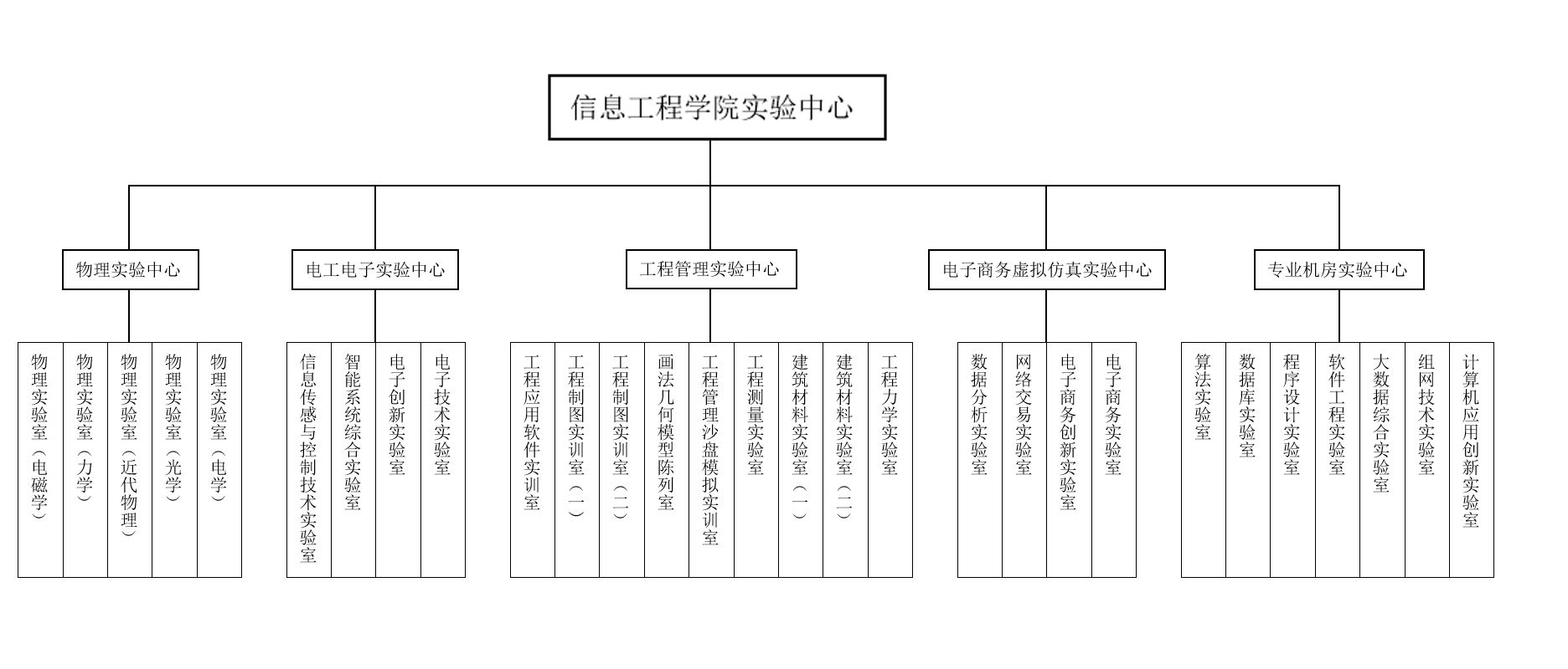 电工电子实验教学中心包含4个实验室,为省级实验教学示范中心;电子商务虚拟仿真实验教学中心包含4个实验室,为省级虚拟仿真实验教学中心;物理实验中心包含5个实验室;工程管理实验中心有9个实验室,为院级实验教学示范中心;专业机房中心包含有7个专业机房。主要分布在科技楼、六号楼、小南门等教学场所。