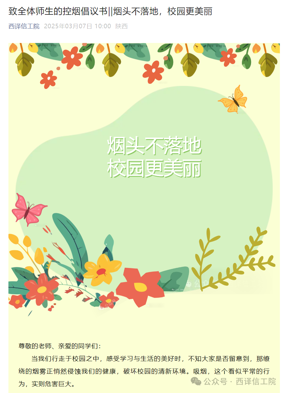 在召开校园控烟专题会议的同时,学院充分利用新媒体平台向广大师生发起控烟倡议书。倡议书中向全体师生发出了呼吁,建议广大师生树立控烟意识,深刻认识吸烟的危害,主动学习控烟知识,并劝阻身边吸烟人员,共同营造无烟环境,将健康生活理念融入日常。