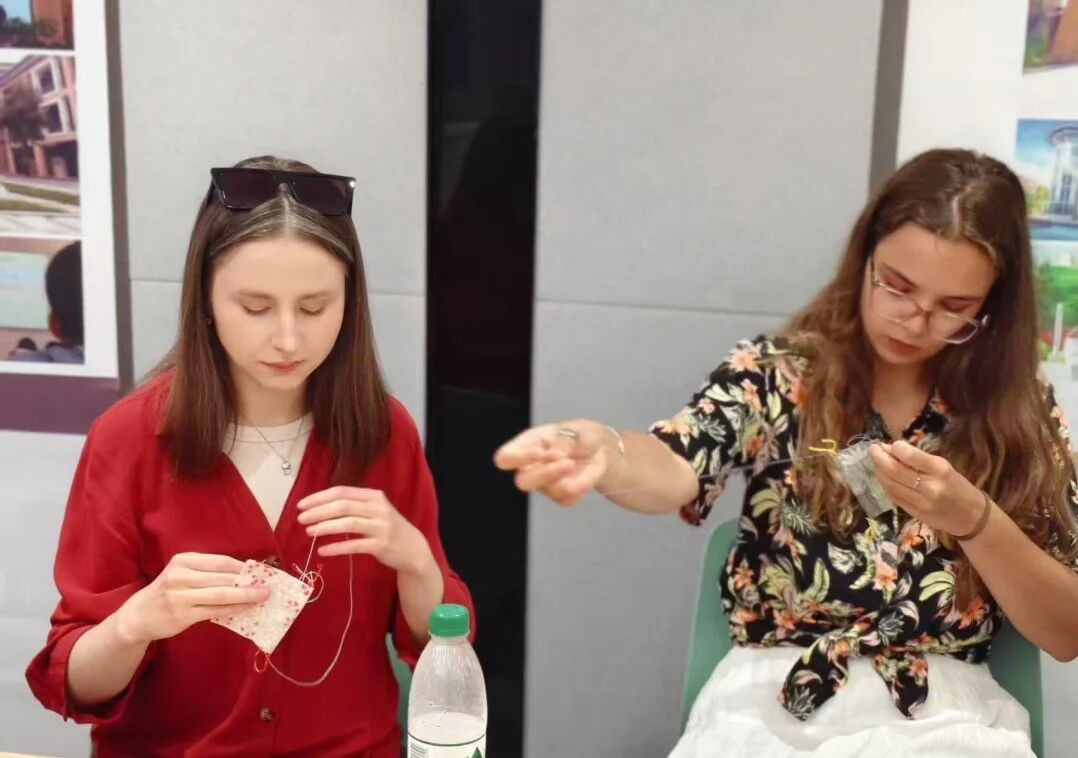 大家围坐,看着志愿者拿彩绸艾草讲解工序。丝线绕指尖,语言相杂,药香袅袅。大家边做香包边分享两国手工艺趣事,随后,同学们以扇为纸、笔为介沉浸书法,中国学生传授,俄罗斯同学专注书写,墨香扇韵交融,书写交流互鉴篇章。