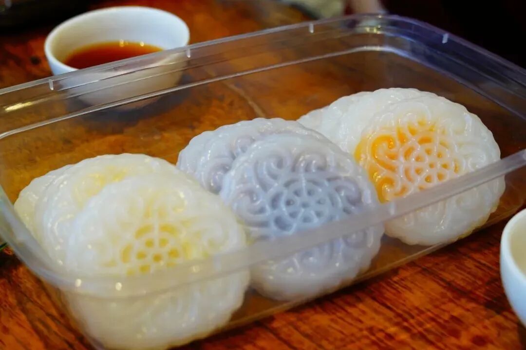 萧师傅指着墙上的奖牌与老照片,向队员们讲述起糕点背后的岁月故事。作为连溪美点的开创者,他于2001年创作出连溪晶饼这一顺德传统名点,同年这项制作技艺便摘得“顺德金牌名小吃”荣誉,而他对这门手艺的坚守已逾二十载。连溪晶饼有着多样馅料选择,以本地早造米为基底,搭配豆沙、莲蓉或是低糖紫薯等食材制成,满足着不同人的口味偏好。至于椰汁糕、桂花糕,则是依托当地丰饶食材逐步研发而成,每一款都藏着顺德人“就地取材、巧思制味”的生活智慧。