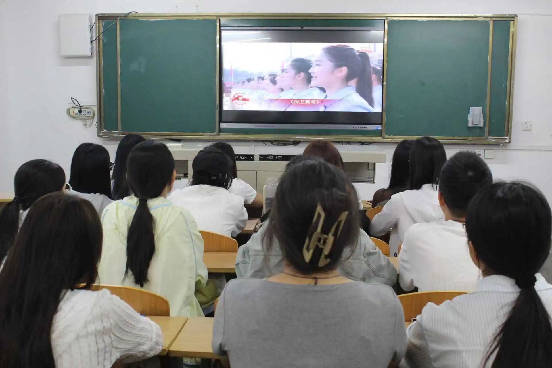 上午 9 时,纪念大会正式开始。护旗方队迈着铿锵有力的步伐护卫国旗行进,每一步都仿佛踏响历史的回声;受阅官兵以严整的军容、昂扬的斗志,展现出新时代军人的铁血担当;自主研发的新型装备方阵依次亮相,彰显了我国国防科技的跨越式发展成就。此时,教室内气氛既庄重又热烈,一幕幕振奋人心的场景,让观看的师生们心中激荡着自豪感与使命感。