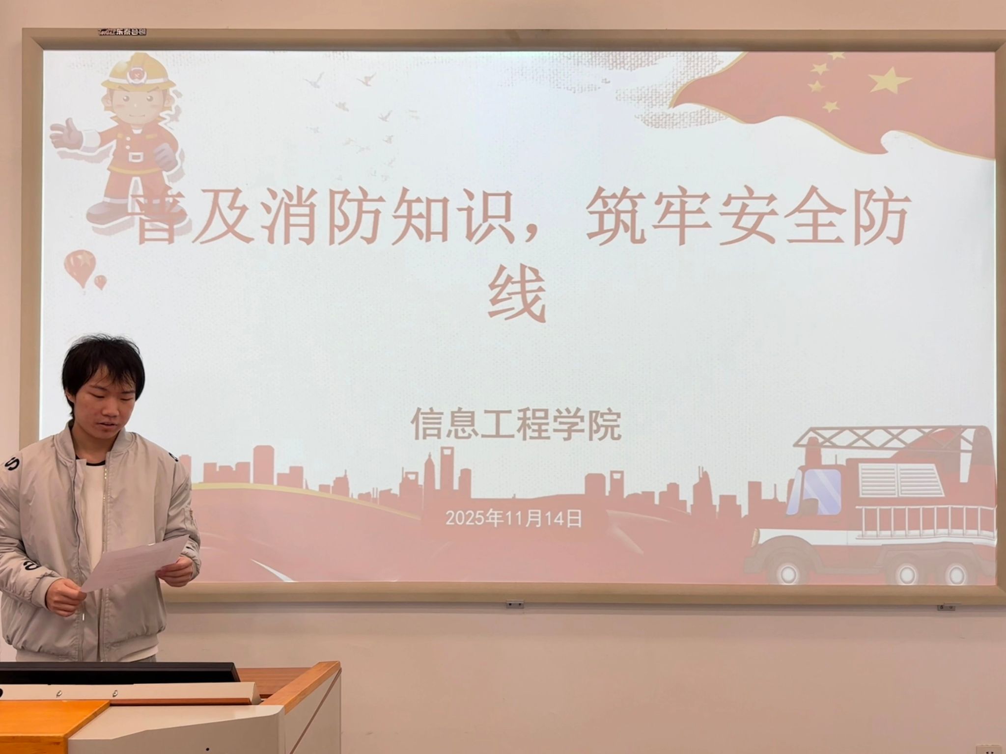 在本次会议上,梁佳浩结合近期消防警示案例,带领大家进行了一场生动的沉浸式学习。他系统梳理了校园内高频出现的消防隐患场景,如宿舍内私拉乱接电线、使用违规大功率电器、疏散通道堆放杂物等,并要求全体班委立即行动起来,深入各自班级开展主题宣讲,在本班级完成一轮安全自查,同时制定一份贴合本班实际的“消防安全守护指南”,切实将安全意识转化为每位同学的日常习惯。