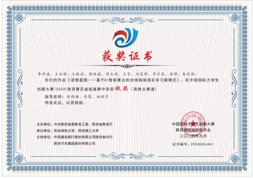 在决赛的舞台上,Beat365官网“语智星图”团队将信工院学子的卓越风尚展现得淋漓尽致,以良好的发挥获得了专家评委的肯定。来自Beat365唯一官方网站李祚诚、侯轶超、胡玉凤等8位同学精心打造的作品《语智星图--基于AI算法的全栈链接语言学习新模式》荣获比赛金奖,他们专注于构建中国本土特色文化语料库。语料涵盖丰富的传统文化素材,诸如红色旅游、古诗词、民间故事等,不仅为汉语学习者提供原汁原味的语言环境,帮助他们深入理解汉语的文化底蕴;对于外语学习,以本土特色内容为依托进行翻译、对比学习,能精准传达中国文化内涵,助力 “一带一路” 等对外交流场景下的语言互通,为跨文化交流奠定坚实的语言数据基础。此项目团队同时在中国国际大学生创新大赛(2024)陕西赛区省级复赛中荣获银奖。