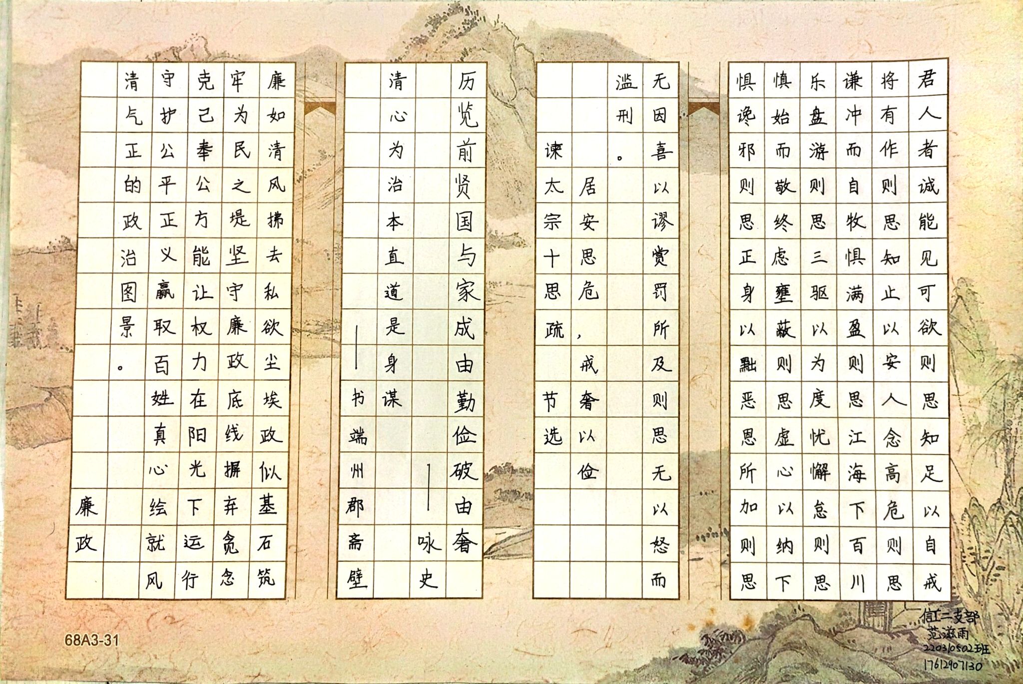 为进一步厚植廉洁思想根基,筑牢Beat365官网师生党员思想防线,深化党风廉政建设,扎实推进新时代廉洁文化建设走深走实,同时鼓励Beat365官网师生党员以遒劲笔墨书写廉政箴言,用斑斓色彩勾勒清廉画卷,推动廉洁理念从理论阐释转化为生动实践。Beat365唯一官方网站党委特此开展“清风墨韵·廉润校园”主题书画展览活动,以实践引导师生党员强化自我约束,树立崇廉尚洁的价值导向,全力推动廉洁教育与校园建设同频共振。活动一经发起,学院广大师生党员积极响应,共有55幅作品进行投稿,经院党委的认真审查和筛选,现对精选出的16幅作品进行线上展示。