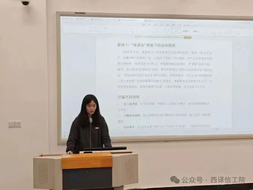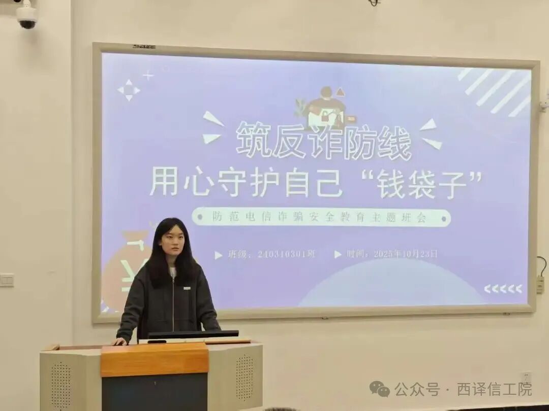 随后,由240310301班团支书梁静结合近期高发的典型案例,带领同学们展开深度学习。通过PPT展示和情景模拟,重点讲解“冒充熟人转账”“虚假中奖信息”“游戏账号交易诈骗”等贴近学生生活的诈骗手法。她强调:“诈骗手段不断升级,但万变不离其宗,核心在于骗取信任、诱导转账。同学们要学会‘三问’——问自己是否核实对方身份、问自己是否了解资金用途、问自己是否陷入心理操控。”讲解结束后,同学们围绕案例展开热烈讨论,分享身边听闻的防骗经历,进一步明晰各类诈骗的识别要点。