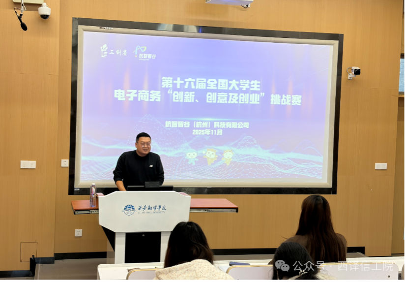 讲座特邀杭智智谷科技有限公司的张博经理担任主讲。张博经理首先系统介绍了“三创赛”的基本概况、广泛影响力与历年参赛规模,并重点回顾了AI电商实战赛的发展历程与现状。随后,他深入剖析了AI电商行业的最新发展趋势及其在具体商业场景中的应用,特别是如何利用人工智能技术高效进行短视频内容生产,为电商运营赋能。针对大学生群体在AI电商创业中可能遇到的实际痛点,张博经理结合案例进行了分析,并给出了中肯建议。他还详细解读了本次“三创赛”AI电商实战赛的评分规则,就参赛报告的逻辑框架、撰写要点以及项目PPT的制作技巧等方面,为同学们提供了极具实用性的指导。