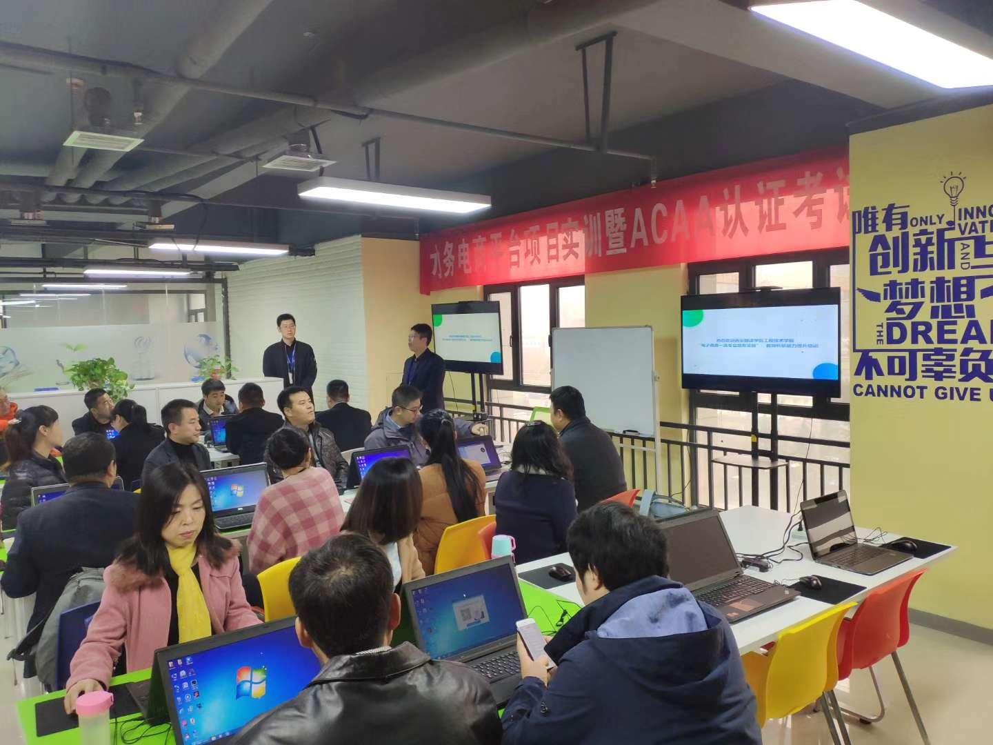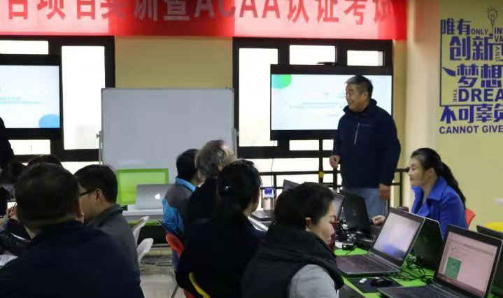 本次培训分为校内培训与企业培训两部分。校内培训时间为每周下午5:40—8:10,广大青年教师克服重重困难,白天工作,晚上培训,以校为家。11月10日—11日,UI/UX设计、前端开发两个方向的全体教师赴山西优逸客科技公司西安分公司完成企业部分培训课程。在企业参加了“水务电商平台商业案例实训”、并参加ACAA认证讲师考试,将获得由中国数字艺术联盟颁发的认证讲师证书。