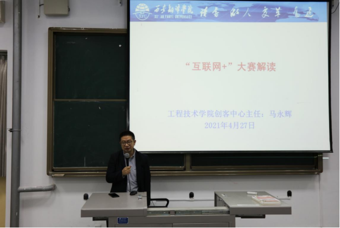 2021年4月27日在722T教室召开了第七届互联网+大学生创新创业大赛动员会。参与讲座的学生来自参赛报名的团队近200人。大会由工程技术学院创客中心主任马永辉主持。