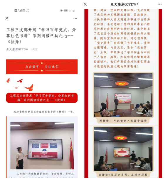 为庆祝中国共产党成立100周年,宣传党的光辉历程和伟大成就,弘扬党的优良传统,五月以来,多次组织相关班级共开展“读红色书籍,学百年党史”主题党日系列活动。活动以分享红色书籍、聆听党史故事的形式展开。学生们用最优美的诗篇展现爱国之情,以对红色经典故事的深情阅读,庆祝中国共产党建党百年。