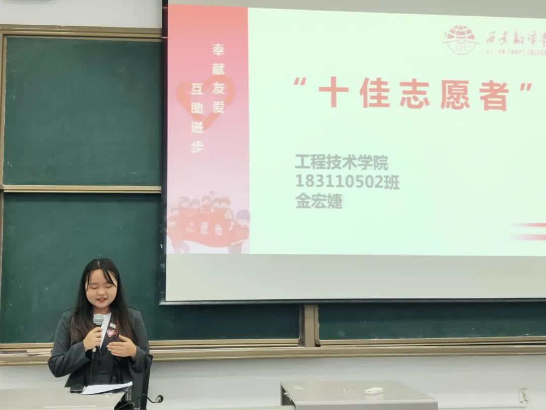 紧接着,十佳志愿者工程技术学院金宏婕,向大家阐述她对志愿服务的认知。她了解到志愿精神,是为了帮助更多人义无反顾勇往直前的强大力量。同时,她认为志愿服务是可以给自身带来快乐,可以教会自身成长的技巧。此外还向大家介绍了一些校外志愿组织,如省级的红十字会等等。
