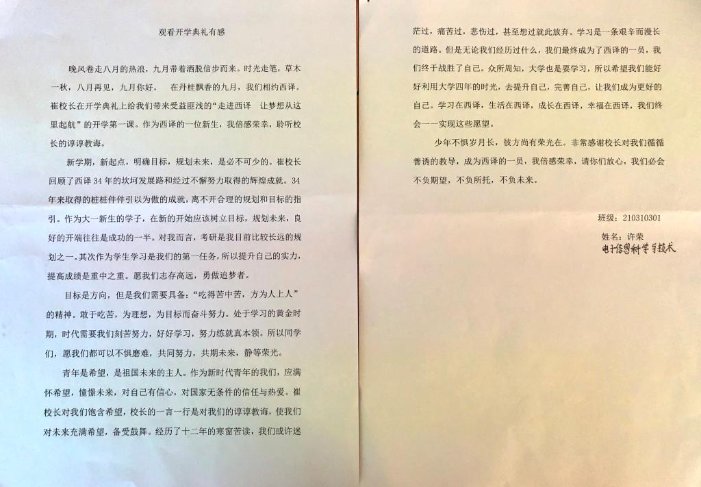 通过崔校长的讲话,让我更加了解西译的过去,也让我更加期待西译的未来。34年来西译始终坚持立德树人的教育理念,培养了大批“外语+专业+现代职业技能”的复合型优秀人才。作为工院2021级新生辅导员,我也会继续带领学生秉承西译“读书、做人、变革、奋进”的校训,让他们能够既仰望星空,又脚踏实地,成为立大志、明大德、成大才、担大任的新时代青年!为西译再创佳绩!