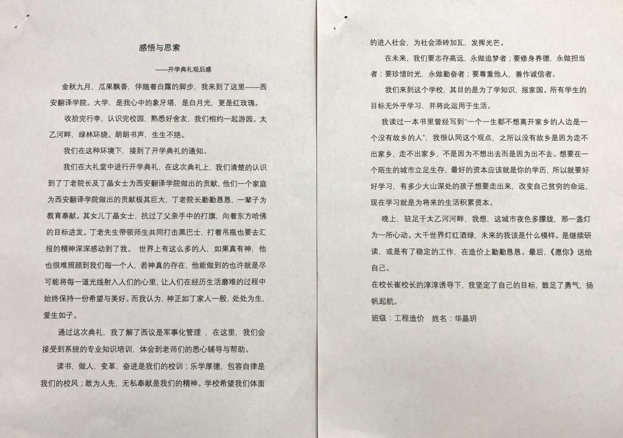 入学教育使我了解了学院的过去,现在与未来。西译是一个管理严格但爱生如子的大学,入学教育使我受益匪浅。在这里,我们将接受系统的理论知识,培养自立自强的人格。想要在一个陌生的城市里立足生存,最好的资本就是你的知识,就要好好学习,多少大山深处的孩子想走出大山改变自己的命运,现在学习就是为将来的生活积累资本。这座古城很美,我想,这城市夜色多朦胧,那一盏灯为一所心动,大千世界灯红酒绿,未来的我该是什么模样,是继续研读或是有稳定工作,在造价路上勤勤恳恳?最后,让我们扬帆起航,勇往直前。西译人,加油!