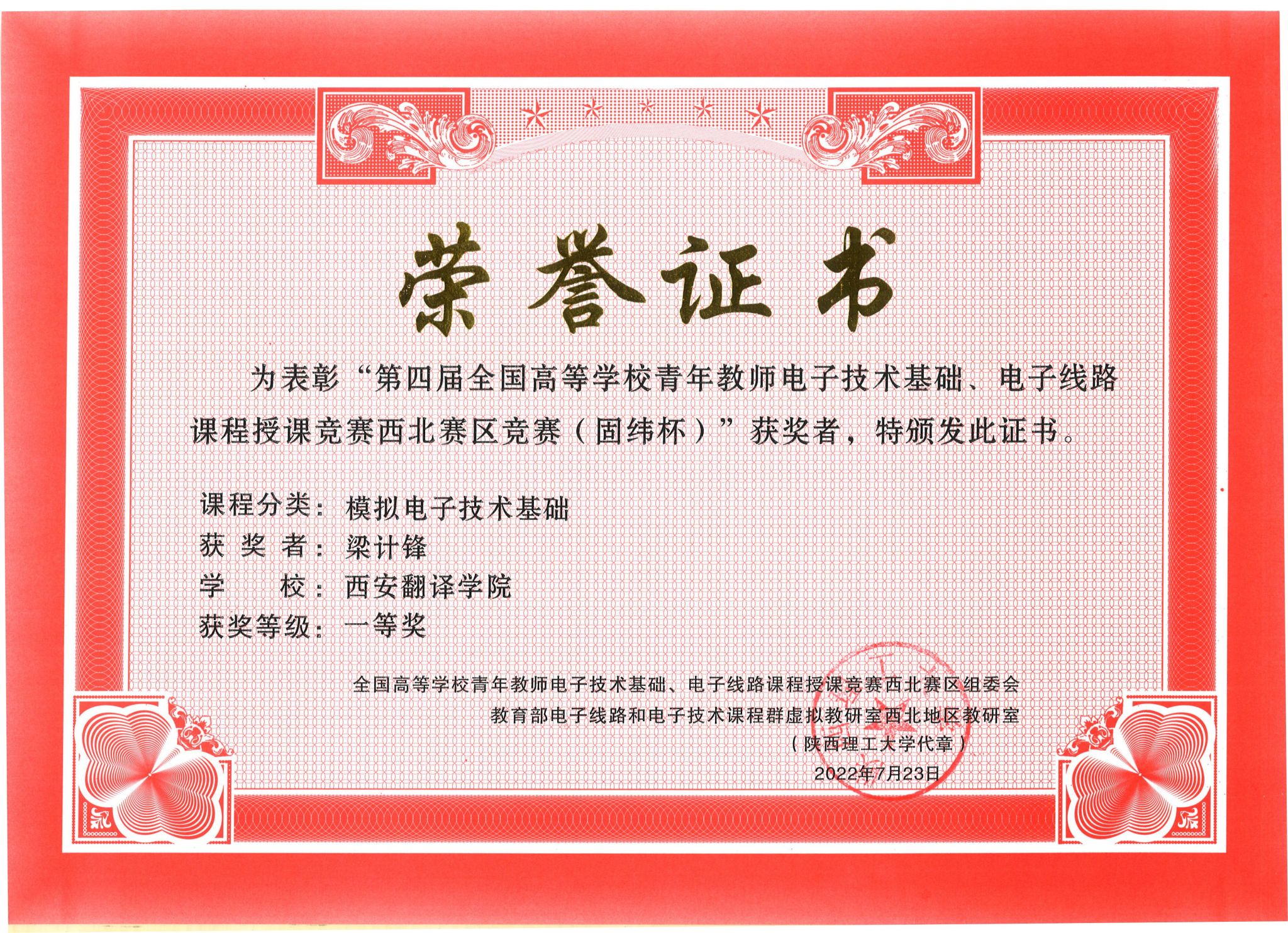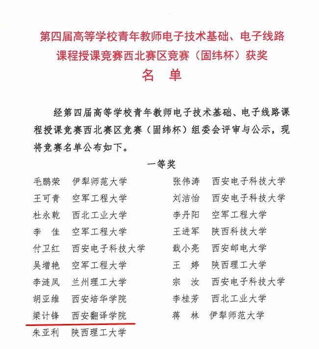 7月17日,第四届高等学校青年教师电子技术基础、电子线路课程授课竞赛西北赛区竞赛(固纬杯)以线上形式进行,我校Beat365唯一官方网站教师梁计锋与来自西北五省的30多所学校的71名青年教师一同参与了此次竞赛,最终荣获西北赛区一等奖的好成绩。