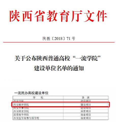 近日,记者从教育厅获悉,陕西普通高校“一流学院”建设单位名单经学校推荐、评前公示、专家审核、结果公示,省厅研究,4月24日正式公布,西安翻译学院等6所民办高校获批为“一流学院”建设单位。根据文件精神,陕西省将重点建设3所国内一流民办高校,西安翻译学院位列其中,另外还有3所民办高校作为“一流学院”建设单位培育项目。随着《关于公布陕西普通高校“一流学院”建设单位名单的通知》(下文简称通知)【陕教2018】71号文件的正式发布,标志着我省“一流学院”正式进入全面布局、建设发展的阶段。
