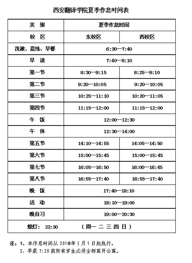 5月4日晚自习起,全校进入夏季作息时间(见附件),请各单位、各部门及时做好相应教学和工作安排。